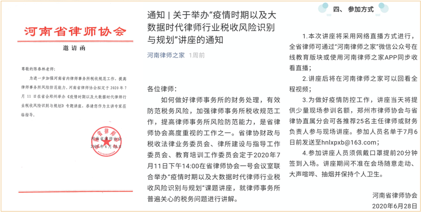 这次讲座是河南省律师协会在国家税收法治建设持续推进大背景下,为规范全省律所和律师的税收行为而举办的。