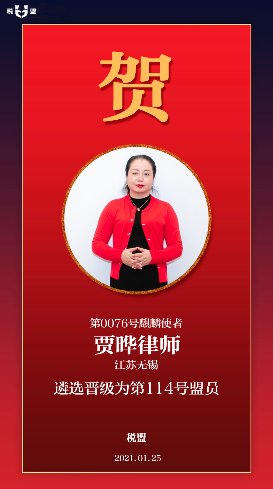 我是税盟第0076号麒麟使者贾晔律师,来自江苏无锡,2020年11月加入税盟。