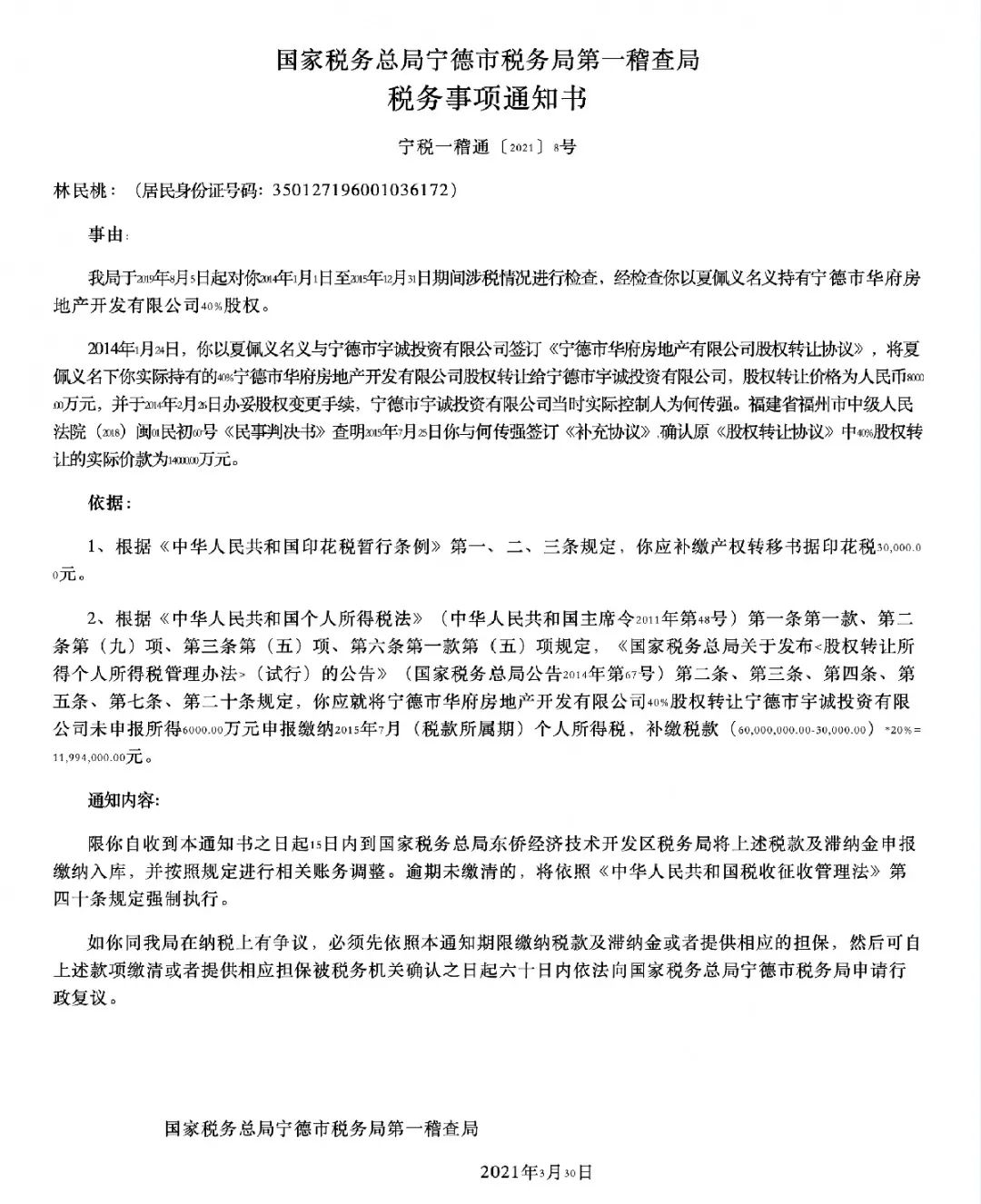 宁德市税务局第一稽查局依据税法,以公告形式通知林民桃补缴产权转移书据《补充协议》的印花税3万元,同时要求林民桃就股权转让未申报所得申报缴纳2015年7月的个人所得税(60000万-3万)*20%=1199.4万元。