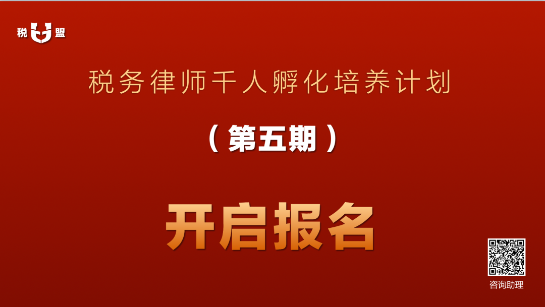 “税务律师千人孵化培养计划”第五期正在招募中,长按下方二维码,添加“税盟助理”咨询报名。