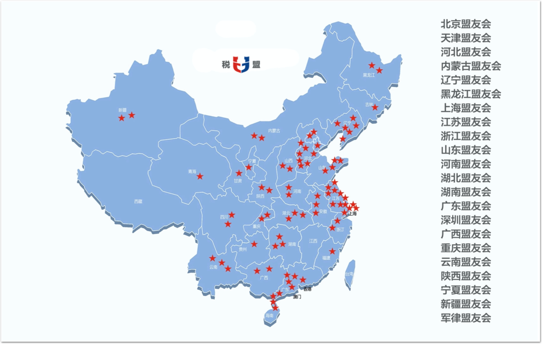 税盟首批设立了15个地方盟友会,4个月后,盟友会增至22个,包含21个地方盟友会和1个军律盟友会,其中人数最多的盟友会,盟友多达42人。每一个盟友会都在税盟领导和片区指导下,个性发展,共同进步。