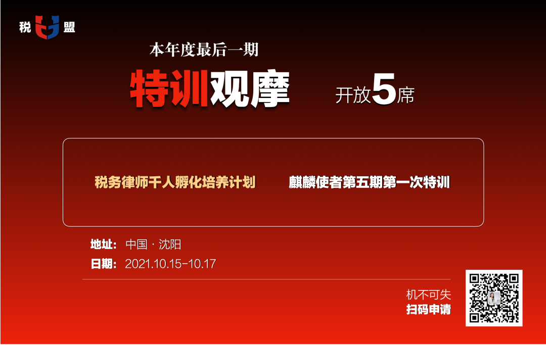 2020年6月,税盟从发展中国税务律师事业的长远大计出发,启动了“税务律师千人孵化培养计划”。一年来,税盟孵化培养进程犹如按了加速键,至今已累计招募培养200余名麒麟使者,各期麒麟使者的转型战绩都成果斐然。为进一步发展税务律师事业,税盟特开放5席观摩名额,为立志转型税务律师的律师同仁提供一个转型良机和学习福利!