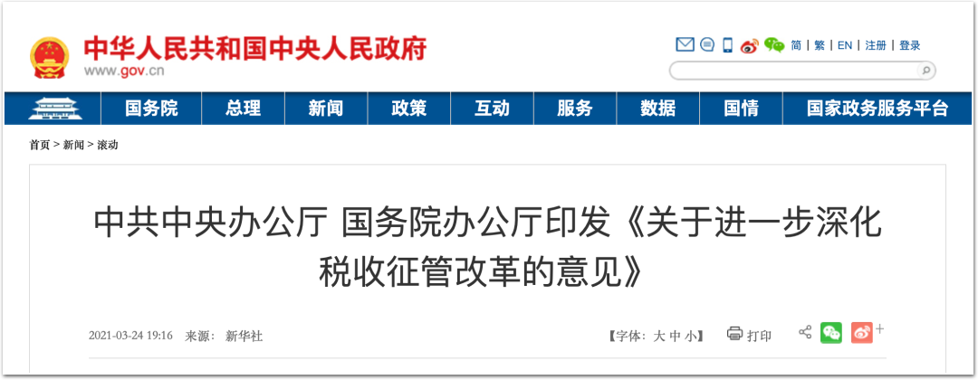 2021年3月24日,中共中央办公厅、国务院办公厅印发了《关于进一步深化税收征管改革的意见》,确定了以“双随机、一公开”监管和“互联网+监管”为基本手段、以重点监管为补充、以“信用+风险”监管为基础的税务监管新体系,实现从“以票管税”向“以数治税”分类精准监管转变。加快推进智慧税务建设,充分运用大数据、云计算、人工智能、移动互联网等现代信息技术,实现税务执法、服务、监管与大数据智能化应用深度融合、高效联动、全面升级。