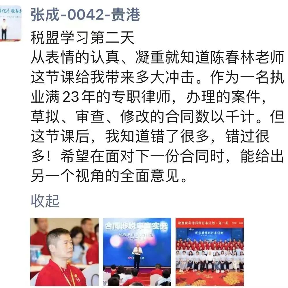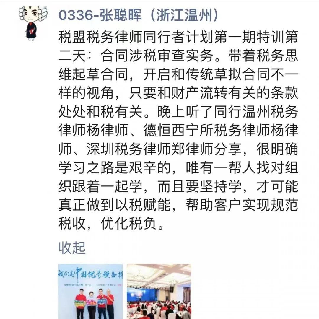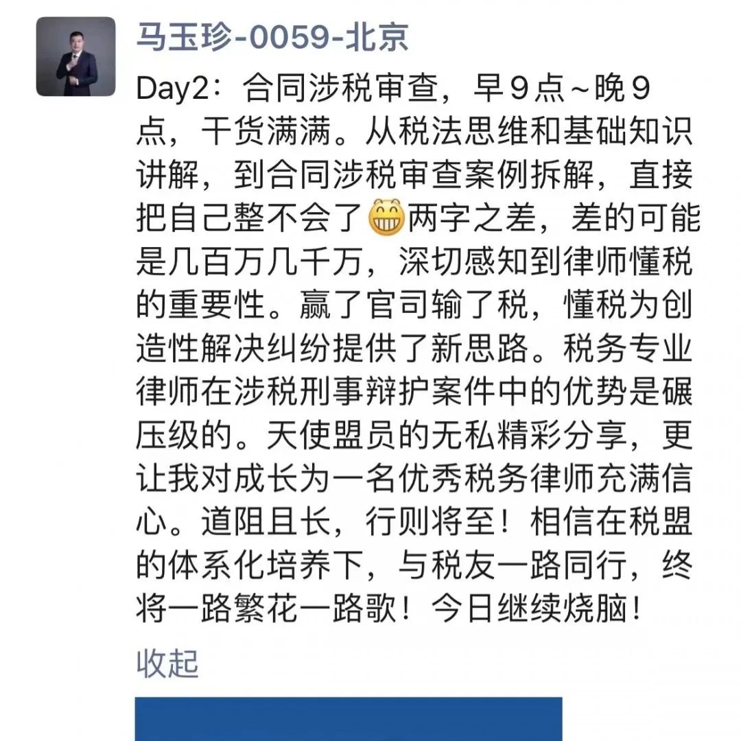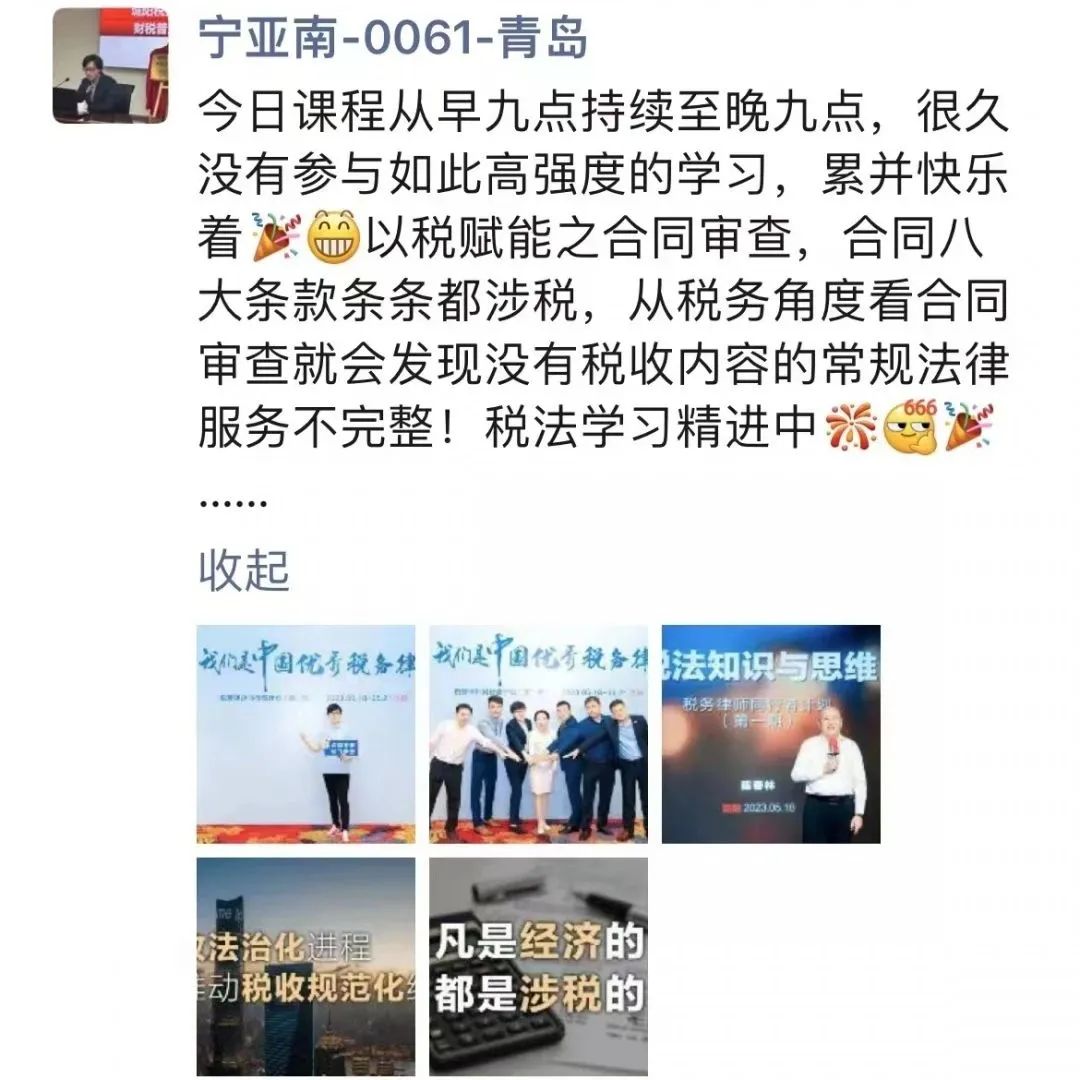 可喜的是,在税盟科学系统培养下,一些同行者已经开始为客户解答涉税咨询,洽谈涉税法律服务项目,扩大了法律服务业务,增强了行业竞争实力,对常法赋能成效倍增。他们的成长,印证了税盟培养实力的强大。