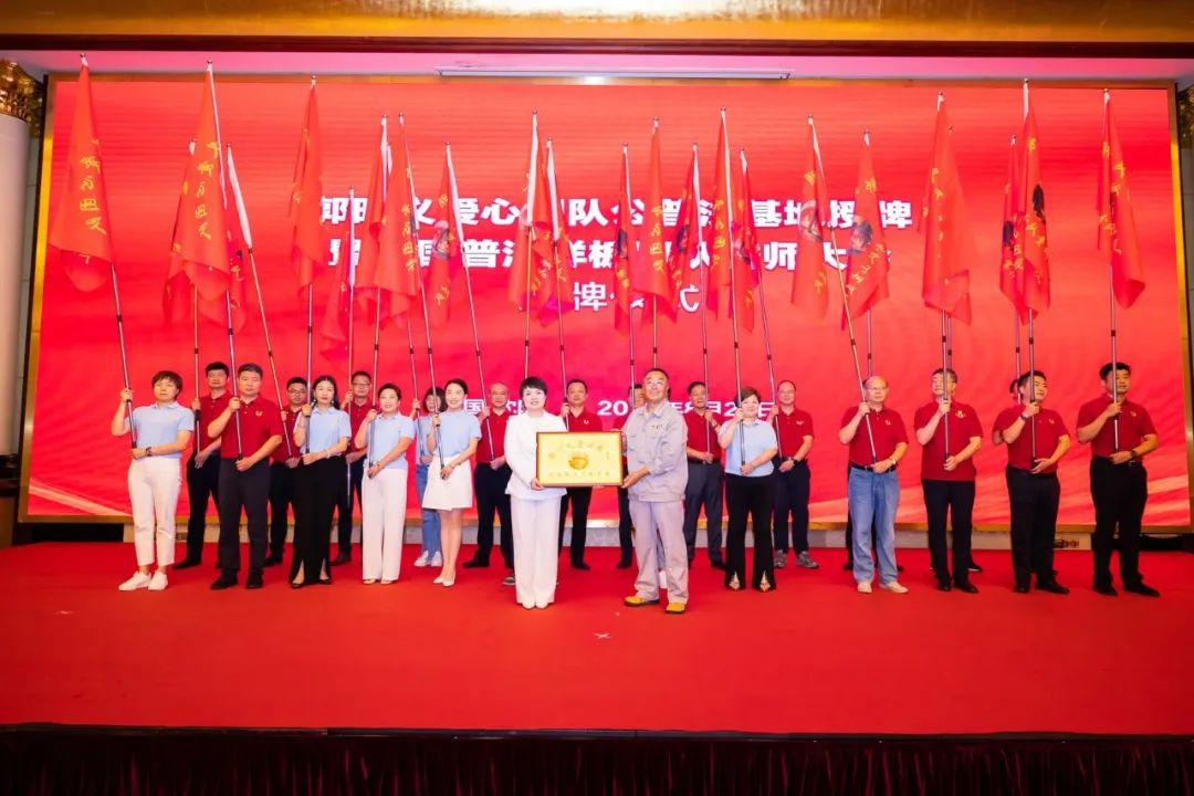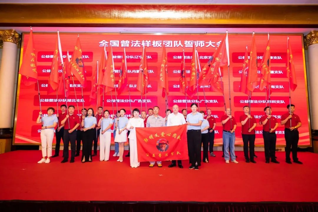授旗仪式上,郭明义主席为公益普法分队下辖24个支队进行授旗,为公益普法活动基地负责人孝璐授牌。