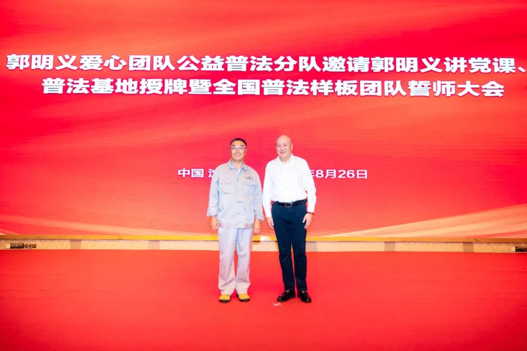 当代雷锋、全国道德模范,十八届、十九届中央候补委员,中华全国总工会副主席郭明义亲临现场,为郭明义爱心团队公益普法活动基地授牌,为全国普法样板团队授旗。