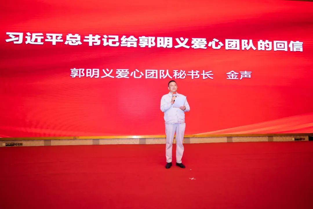 郭明义爱心团队秘书长金声为大家宣读“习近平总书记给郭明义爱心团队的回信”,现场掌声连连。