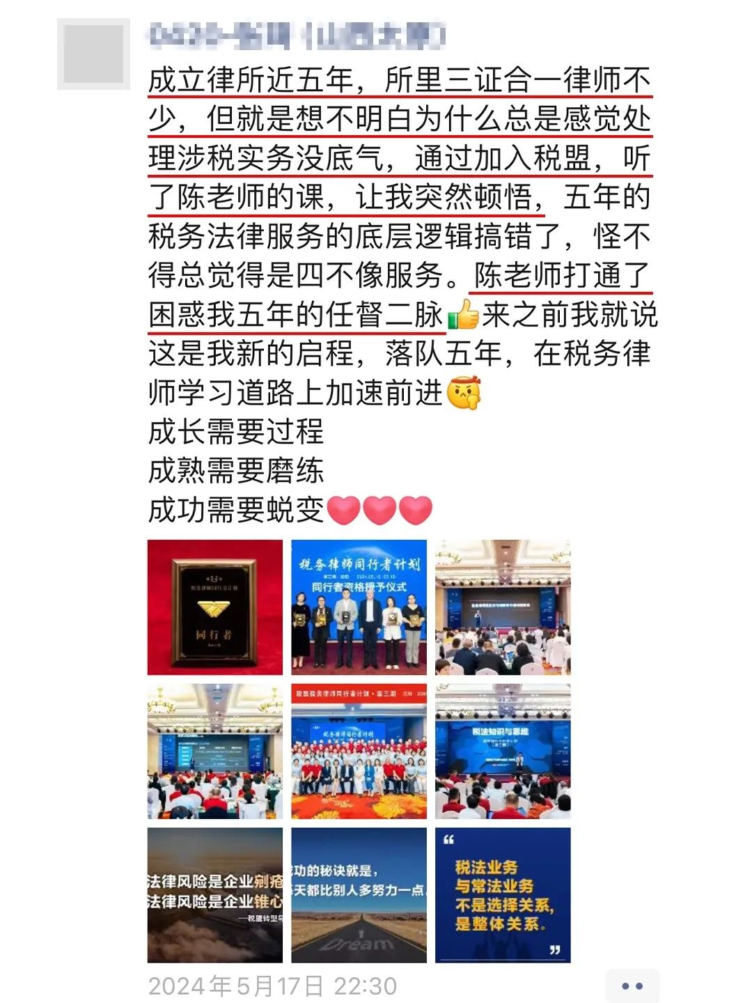 在税盟税务律师同行者计划开展过程中,我们见证了许多律师的成长与蜕变。其中,有几位律师早在税盟成立初期就开始关注,以下是两位律师的心声: