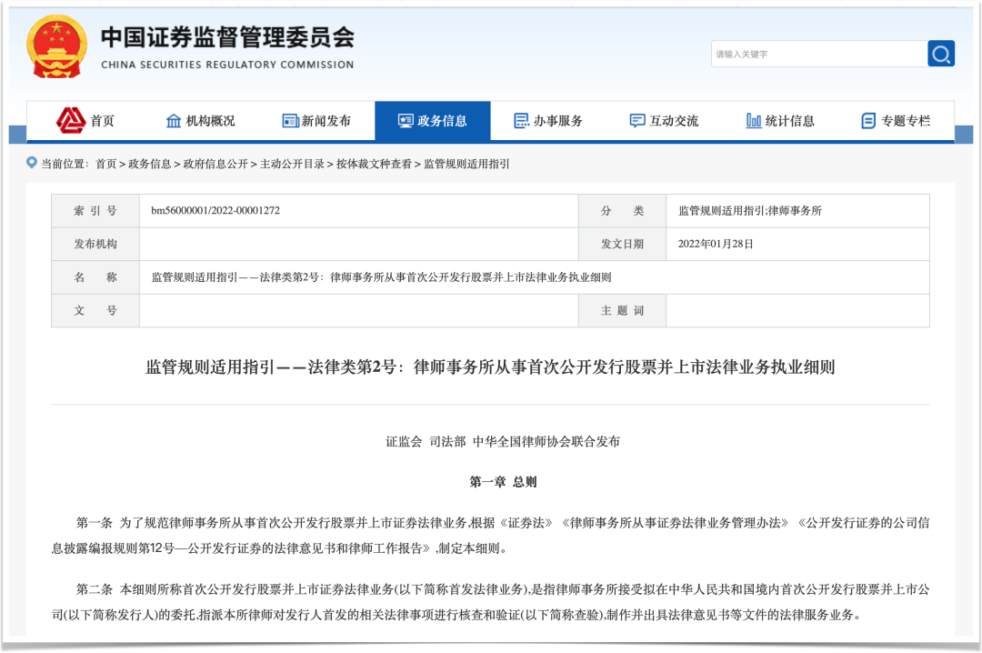 2022年1月28日,中国证券监督管理委员会通过其官方网站正式颁布了《监管规则适用指引——法律类第2号:律师事务所从事首次公开发行股票并上市法律业务执业细则》,这一重要文件的出台,标志着中国资本市场法治化建设再次迈出了坚实的一步。