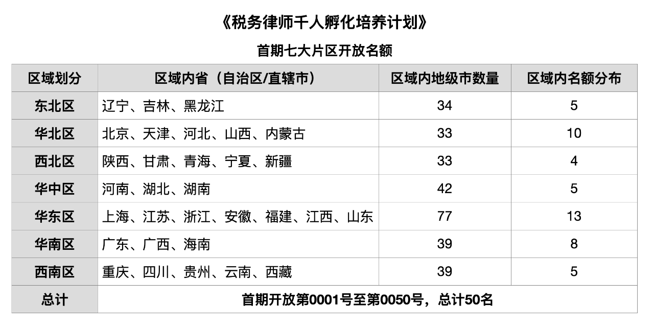 联盟计划每期招募50名律师参加“千人孵化计划”,名额分布采取“区域限额,城市不限”的原则,按照东北、华北、西北、华中、华东、华南、西南七个区域进行分配,既照顾到国内不同地区律师转型税务律师需求,也考虑各区域税收法律服务的客户广泛性和发展均衡性。